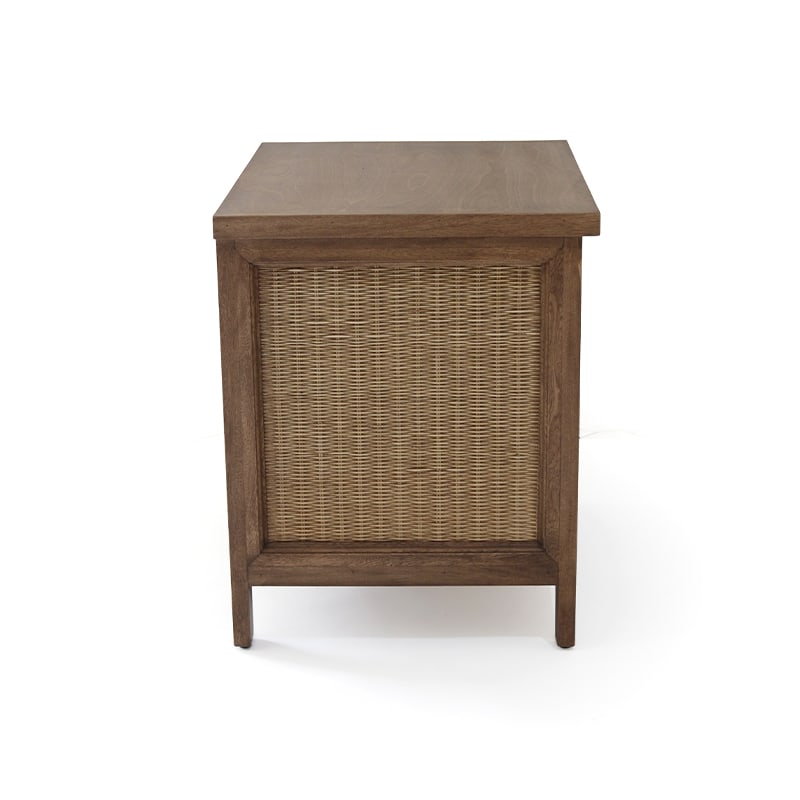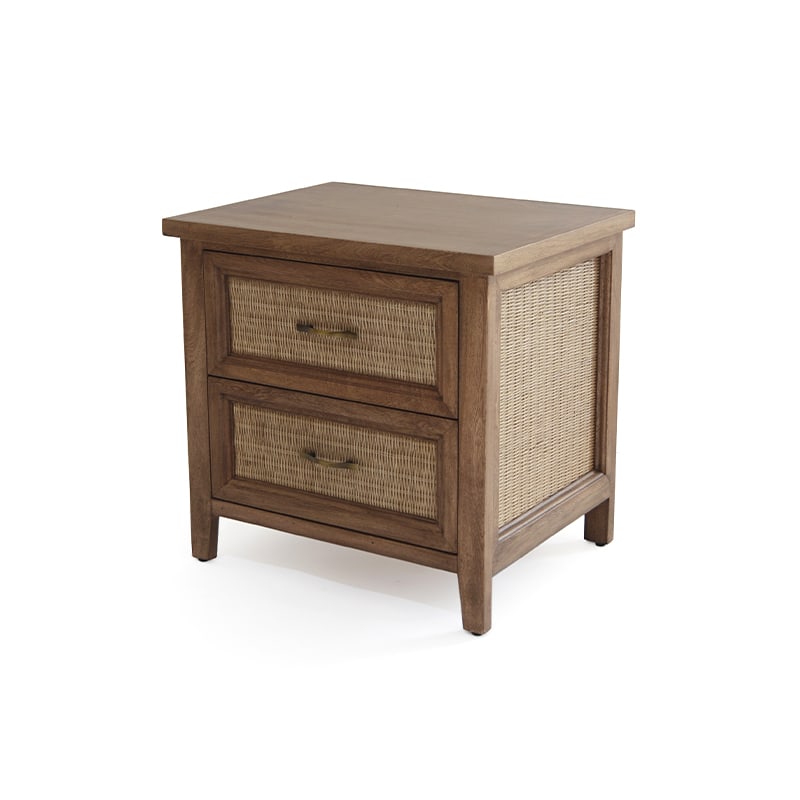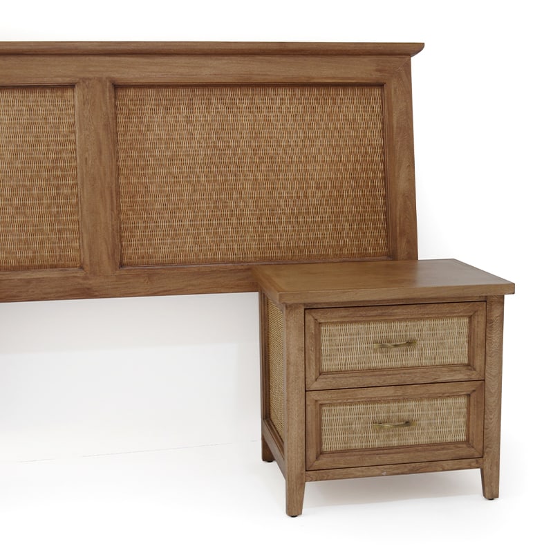Conformado por dos cajones. Estructura de madera rosa morada. Tejida de rejilla con fibra natural de rattan en color nogal oscuro antique. Acabado en laca y sellador de poliuretano.