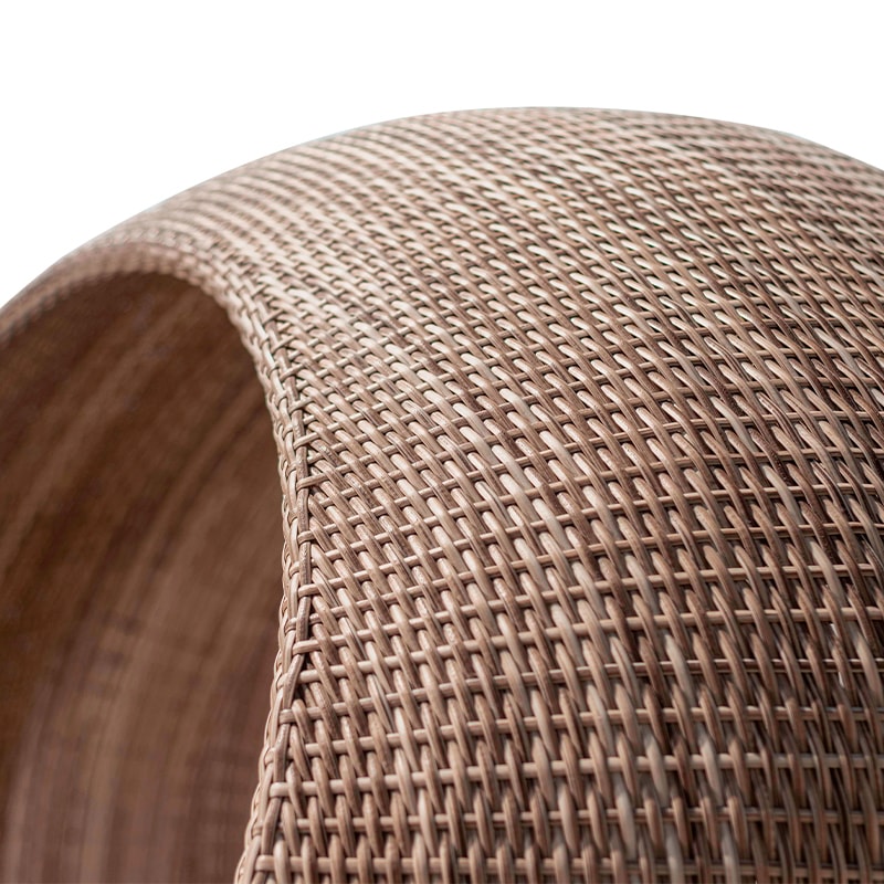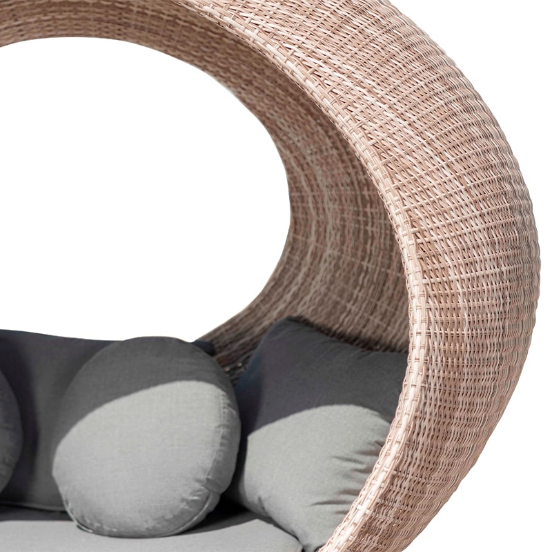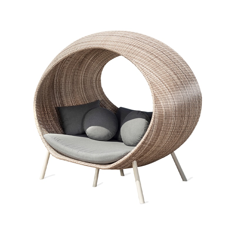 El modelo Saturno es un refugio contemporáneo con múltiples almohadas, tejido con polirattan sintético para todo clima.