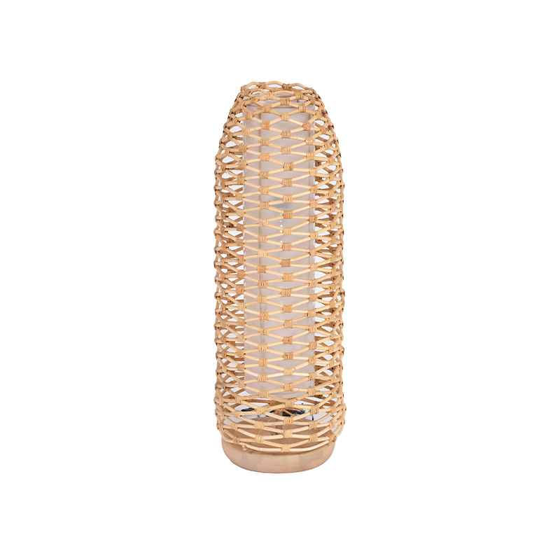 Esta elegante lámpara de mesa decorativa está elaborada con una base de madera y una estructura artesanal de vara de ratán natural tejida a mano por artesanos mexicanos, creando un diseño cálido y natural que ilumina con estilo cualquier espacio.