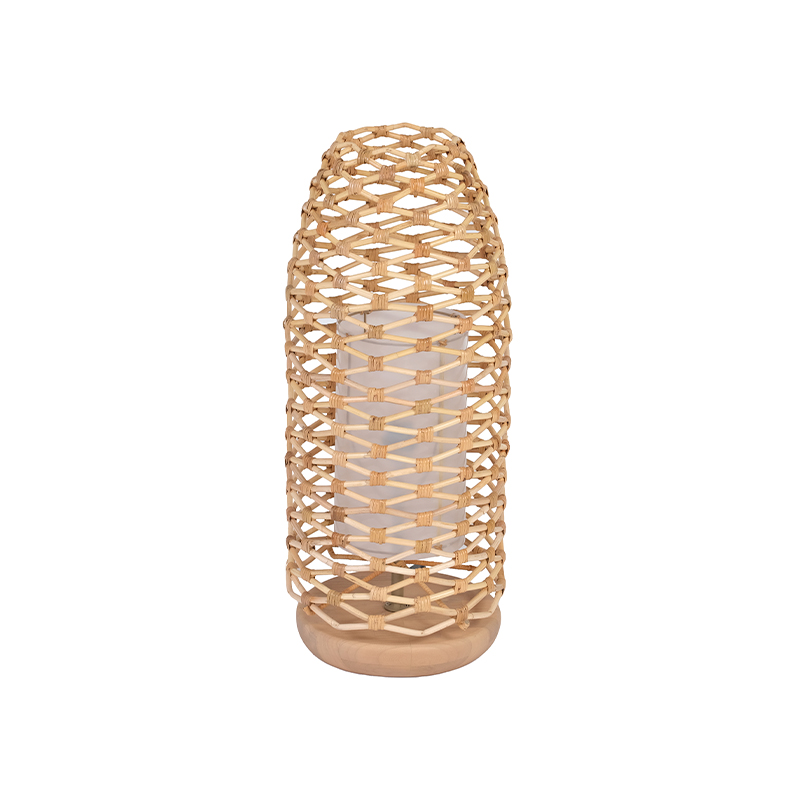 Esta elegante lámpara de mesa decorativa está elaborada con una base de madera y una estructura artesanal de vara de ratán natural tejida a mano por artesanos mexicanos, creando un diseño cálido y natural que ilumina con estilo cualquier espacio.