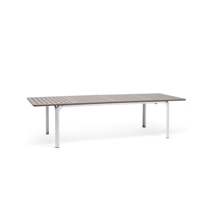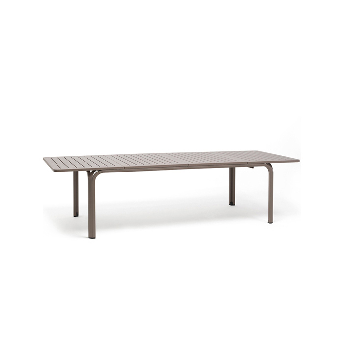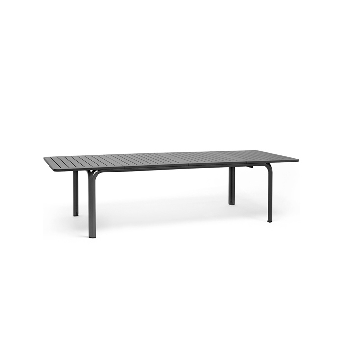 Mesa extensible. Material: tablero DurelTop en polipropileno tratado anti UV y teñido en masa. Patas en aluminio pintado. Efecto mate. Tacos regulables. 210 – 280 x 100 x 73h cm. Resina reciclable.