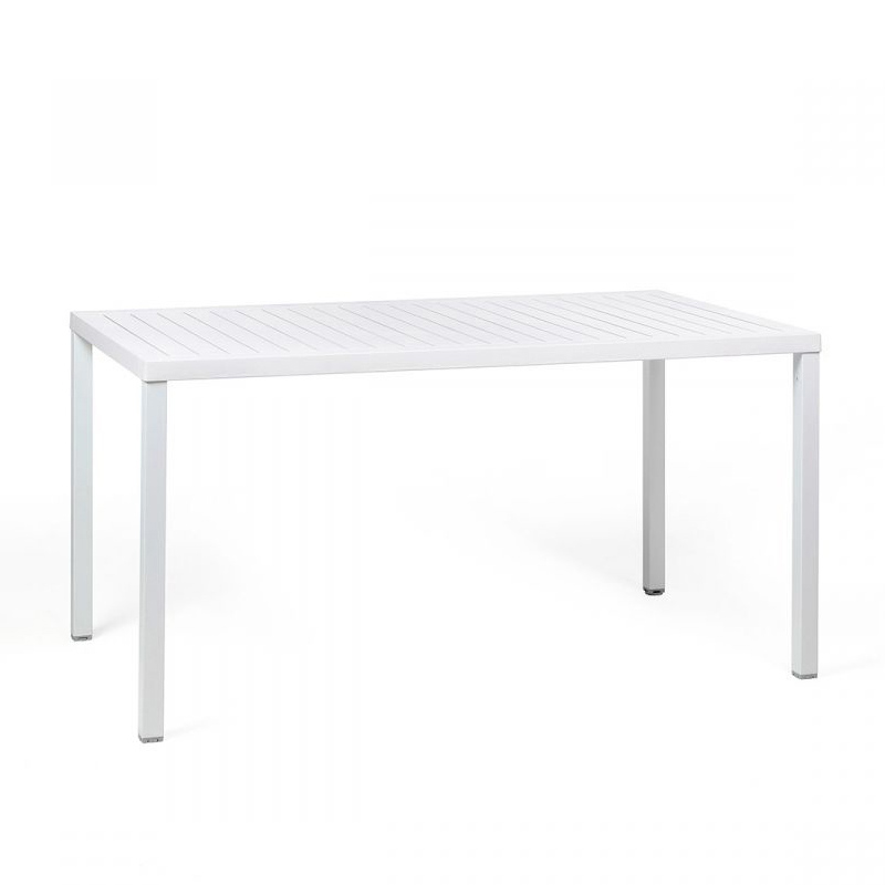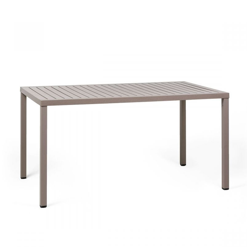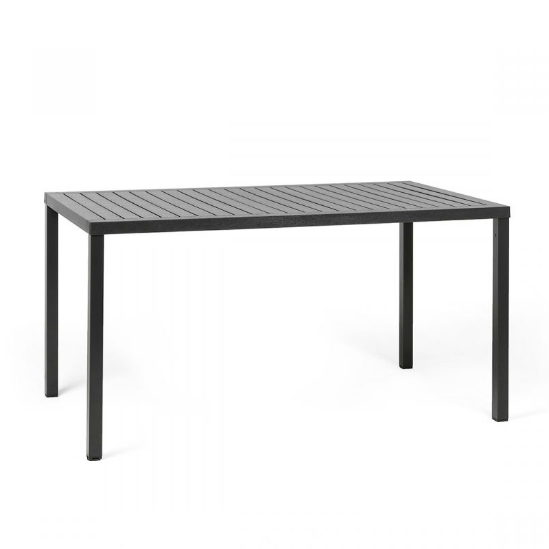 Mesa apilable 140X80 cm. Material: tablero DurelTOP en polipropileno tratado anti UV y teñido en masa. Patas en aluminio pintado. Efecto mate. Tacos Regulables. Resina reciclable.