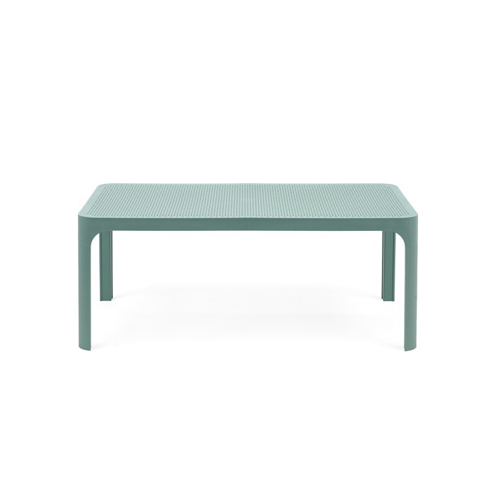 Elegante mesita auxiliar de resina de fibra de vidrio tintada en bloque con superficie rectangular caracterizada por un motivo perforado que recuerda el leitmotiv de toda la colección Net.