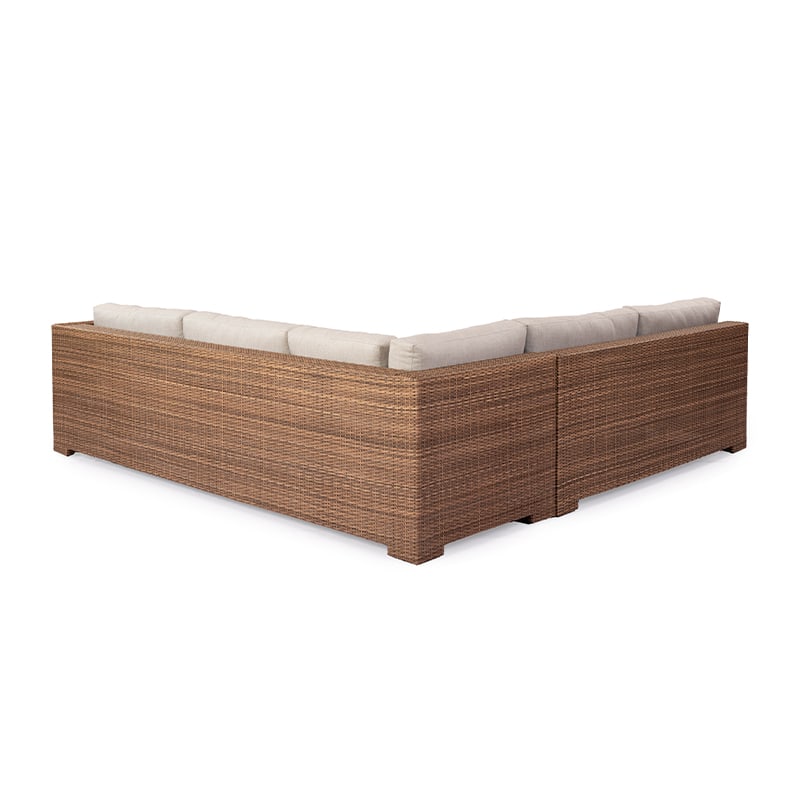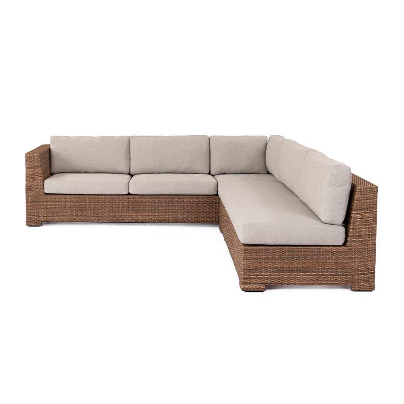 El diseño está elaborado con estructura de aluminio recubierta en fibra sintética tejida a mano, ideal para exteriores. Los cojines, en tela especial para intemperie, brindan suavidad y resistencia a los elementos.