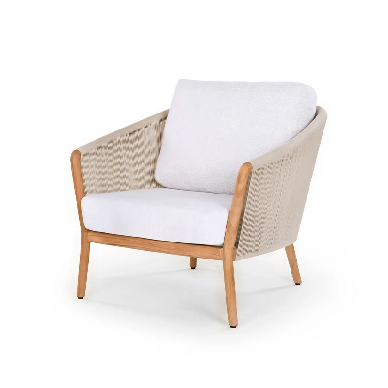 La Sala Miramar combina elegancia contemporánea y confort absoluto, con una estructura de madera natural que aporta calidez y un diseño envolvente tejido en cuerda rope que ofrece soporte y estilo. Sus cojines amplios y suaves en tonos claros crean un ambiente relajante y sofisticado, ideal para terrazas, salas exteriores o interiores modernos. Su diseño equilibrado, resistente y atemporal la convierte en una colección perfecta para quienes buscan estética, comodidad y durabilidad en un mismo conjunto.
