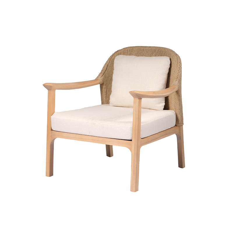 Este elegante sillón combina una estructura de madera de teca con un respaldo de tejido sintético tipo palma, elaborado artesanalmente por manos mexicanas. Su diseño ergonómico y sus cojines acolchados ofrecen el máximo confort, convirtiéndolo en una pieza ideal para muebles de terraza, jardín o salas exteriores de lujo.
