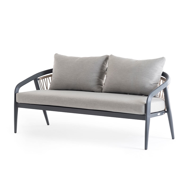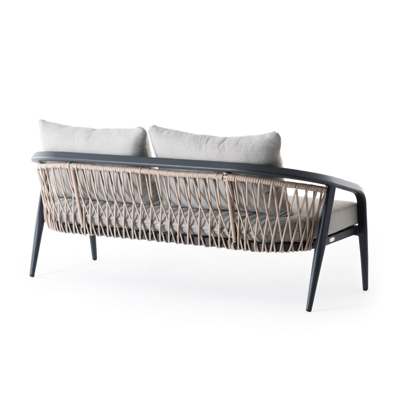Este elegante sofá de dos plazas está fabricado con estructura de aluminio con acabado resistente a la intemperie, ideal para exteriores. Su diseño curvo y moderno se complementa con un respaldo trenzado en cuerda náutica, que aporta textura y ventilación. Los cojines, tapizados en tela para exterior, brindan un confort excepcional y durabilidad frente a la exposición solar y la humedad.