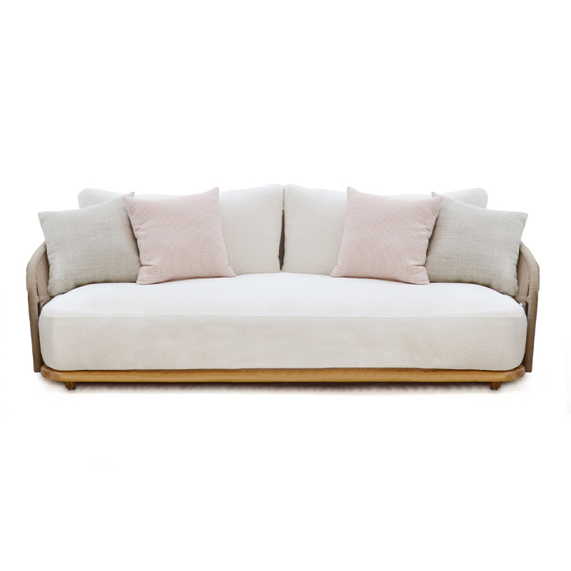 El Sofá Marena destaca por su silueta curva y armoniosa que invita al descanso, complementada con laterales tejidos que aportan carácter artesanal y modernidad. Sus cojines generosos en tonos claros brindan confort y luminosidad, creando un ambiente acogedor y elegante. Perfecto para espacios sociales que buscan equilibrio entre diseño contemporáneo, funcionalidad y sofisticación natural.