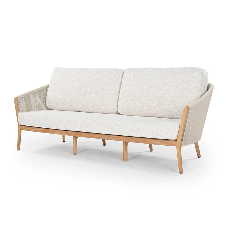 La Sala Miramar combina elegancia contemporánea y confort absoluto, con una estructura de madera natural que aporta calidez y un diseño envolvente tejido en cuerda rope que ofrece soporte y estilo. Sus cojines amplios y suaves en tonos claros crean un ambiente relajante y sofisticado, ideal para terrazas, salas exteriores o interiores modernos. Su diseño equilibrado, resistente y atemporal la convierte en una colección perfecta para quienes buscan estética, comodidad y durabilidad en un mismo conjunto.