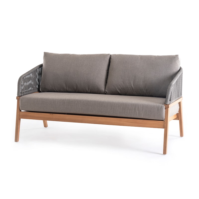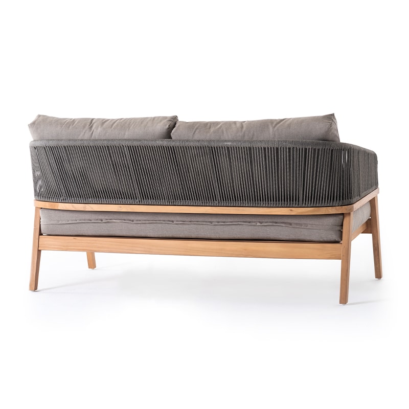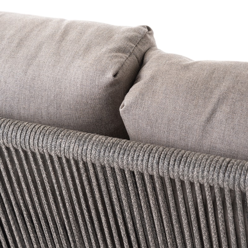 Este sofá de tres plazas destaca por su elegante estructura de madera de teca y su respaldo tejido a mano en cuerda náutica color gris taupe, que aporta textura y frescura al diseño. Sus líneas curvas ofrecen una sensación envolvente y cómoda, mientras que los cojines en tela para intemperie brindan confort superior y alta resistencia a los rayos UV y la humedad.
